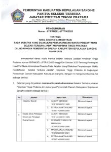 Sangihe – Berikut Pengumuman Hasil Seleksi Administrasi pada Jabatan yang dilakukan Perpanjangan Waktu Pendaftaran Seleksi Terbuka Jabatan Pimpinan Tinggi Pratama di Lingkungan Pemerintah Daerah Kabupaten Kepulauan Sangihe Tahun 2025.