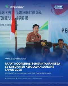 Tahuna, Kamis 06 November 2025 – Pemerintah Kabupaten Kepulauan Sangihe melalui Dinas Pemberdayaan Masyarakat dan Desa (PMD) menyelenggarakan Rapat Koordinasi Pemerintahan Desa se-Kabupaten Kepulauan Sangihe yang bertempat di Papanuhung Santiago Tampungang Lawo, Tahuna.