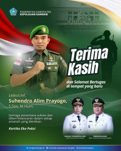 Pemerintah Kabupaten Kepulauan Sangihe menyampaikan apresiasi yang setinggi-tingginya kepada Letkol Inf. Suhendro Alim Prayogo, S.Sos., M.Hum. atas dedikasi, pengabdian, dan kontribusi yang telah diberikan selama menjabat sebagai Komandan Kodim 1301/Sangihe.