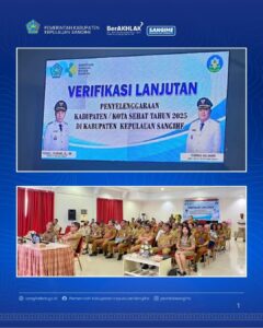 Sangihe, 25 Agustus 2025 – Pemerintah Kabupaten Kepulauan Sangihe mengikuti Verifikasi Lanjutan Penyelenggaraan Kabupaten/Kota Sehat (KKS) Tahun 2025 oleh Tim Verifikator Tingkat Pusat. Kegiatan ini dilaksanakan secara virtual dari Ruang Serbaguna Rumah Jabatan Bupati Kepulauan Sangihe, Senin (25/8/2025).
