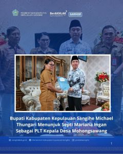 Sangihe, – Bertempat diruang VIP rumah jabatan Bupati Kepulauan Sangihe,Bupati Sangihe Michael Thungari SE MM menyerahkan SK sebagai Pelaksana Harian (PLH) kapitalaung mohong sawang kecamatan kendahe kepada ibu Septi Mariana Ingan.selasa (25/11/2025).