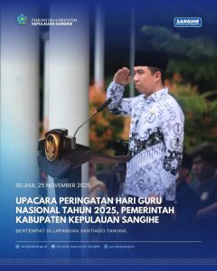 Sangihe — Selasa, 25 November 2025, Pemerintah Kabupaten Kepulauan Sangihe melaksanakan Upacara Bendera dalam rangka memperingati Hari Guru Nasional Tahun 2025 yang berlangsung di Lapangan Santiago, Tahuna. Upacara dipimpin oleh Bupati Kepulauan Sangihe, Bapak Michael Thungari, S.E., M.M., dan dihadiri oleh jajaran pemerintah daerah, tenaga kependidikan, serta para guru dari berbagai sekolah.