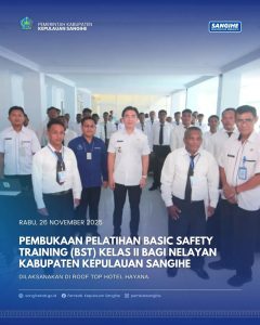 Sangihe – Bupati Kepulauan Sangihe, Bapak Michael Thungari, S.E., M.M., secara resmi membuka Pelatihan Basic Safety Training (BST) Kelas II bagi para nelayan, yang bertempat di Roof Top Hotel Hayana. Kegiatan ini terselenggara melalui kerja sama antara Dinas Perikanan Daerah Kabupaten Kepulauan Sangihe dan Balai Pelatihan dan Penyuluhan Perikanan (BP3) Bitung. (26/11/25)