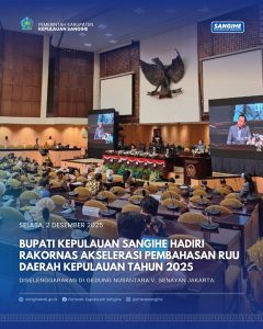 Sangihe, – Bupati Kepulauan Sangihe, Michael Thungari, S.E., M.M., menghadiri Rapat Koordinasi Nasional Akselerasi Pembahasan RUU tentang Daerah Kepulauan dalam Prolegnas Prioritas Tahun 2025 yang diselenggarakan oleh DPD RI di Gedung Nusantara V, Senayan Jakarta. Kegiatan ini diikuti oleh para bupati dari berbagai wilayah kepulauan di Indonesia, termasuk perwakilan dari Provinsi Sulawesi Utara. (02/12/25)