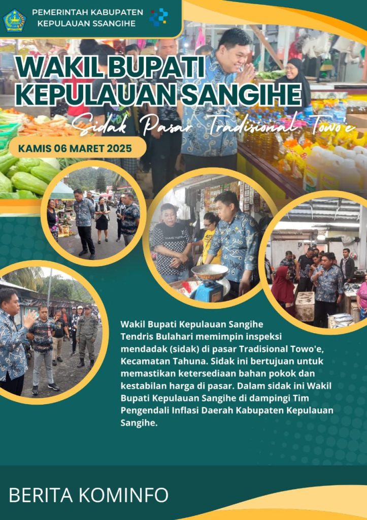 Tahuna (06/03/2025) Menjelang memasuki Lebaran Wakil Bupati Kepulauan Sangihe Tendris Bulahari memimpin Inspeksi mendadak (sidak) ke Pasar Tradisional Towo’e Kecamatan Tahuna. Kegiatan ini bertujuan untuk memastikan ketersedian bahan pokok dan kestabilan harga pasar, Dalam sidak ini Wakil Bupati didampingi Tim Pengendali Inflasi Daerah Kabupaten Kepulauan Sangihe.