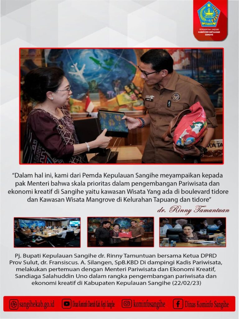 Terus Bekerja dan Berusaha demi Sangihe Hebat Pj. Bupati Kepulauan Sangihe Bertemu Sandiaga Salahuddin Uno Menteri Pariwisata dan Ekonomi Kreatif dalam rangka Pengembangan Pariwisata dan Ekonomi Kreatif di Kabupaten Kepulauan Sangihe.