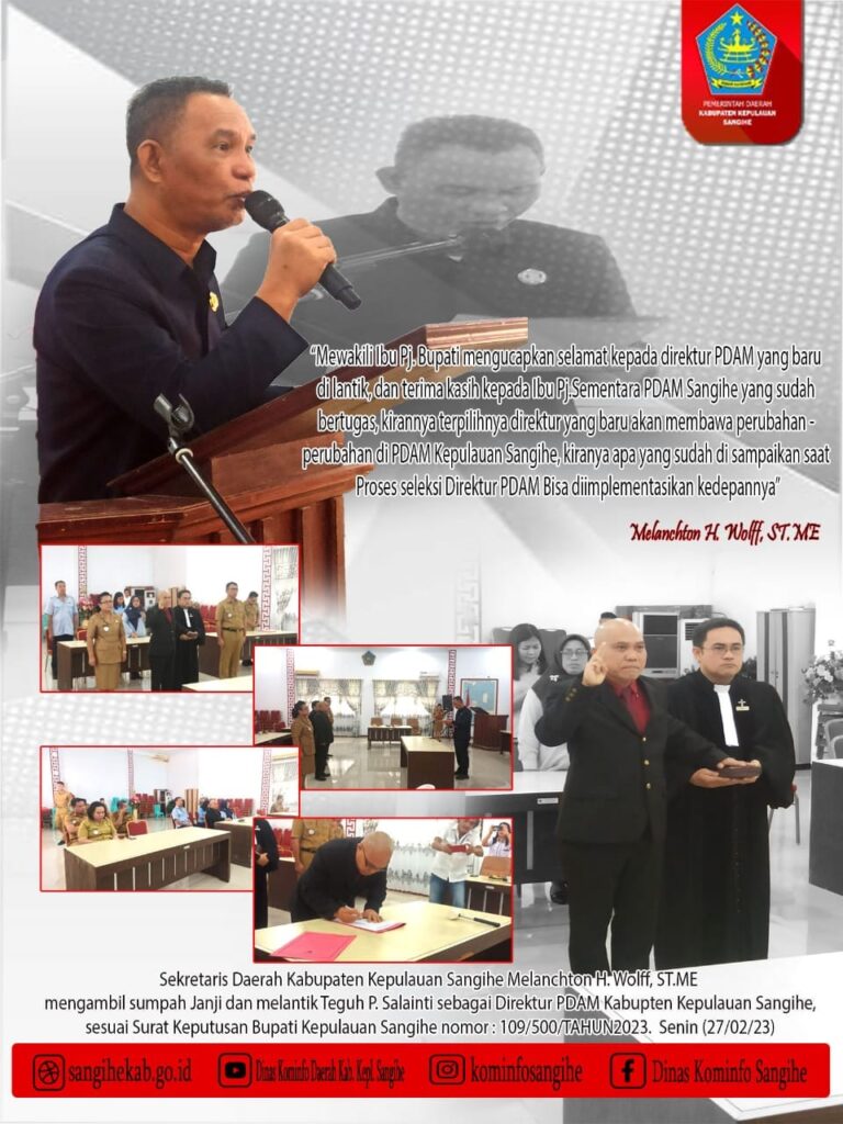 Senin, 27 Februari 2023 bertempat di Ruang Serbaguna Kantor Bupati Kepulauan Sangihe Sekretaris Daerah Melancthon H. Wolf. ST, ME mengambil sumpah janji dan Pelantikan Direktur PDAM Kab. Kepulauan Sangihe yang baru Teguh P. Salainti. Semoga dengan Direktur PDAM yang baru membawa Perbaikan dan Perubahan baru ditubuh Perusahaan Daerah ini.