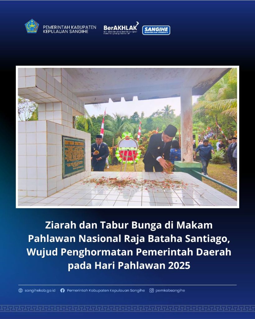 Sangihe — Dalam rangka memperingati Hari Pahlawan Nasional yang jatuh pada tanggal 10 November 2025, Pemerintah Kabupaten Kepulauan Sangihe melaksanakan upacara ziarah dan tabur bunga di Makam Pahlawan Nasional Raja Bataha Santiago, Kampung Karatung I, Kecamatan Manganitu, Sabtu (10/11/2025). Kegiatan ini dipimpin langsung oleh Bupati Kepulauan Sangihe, Bapak Michael Thungari, S.E., M.M., didampingi Wakil Bupati […]