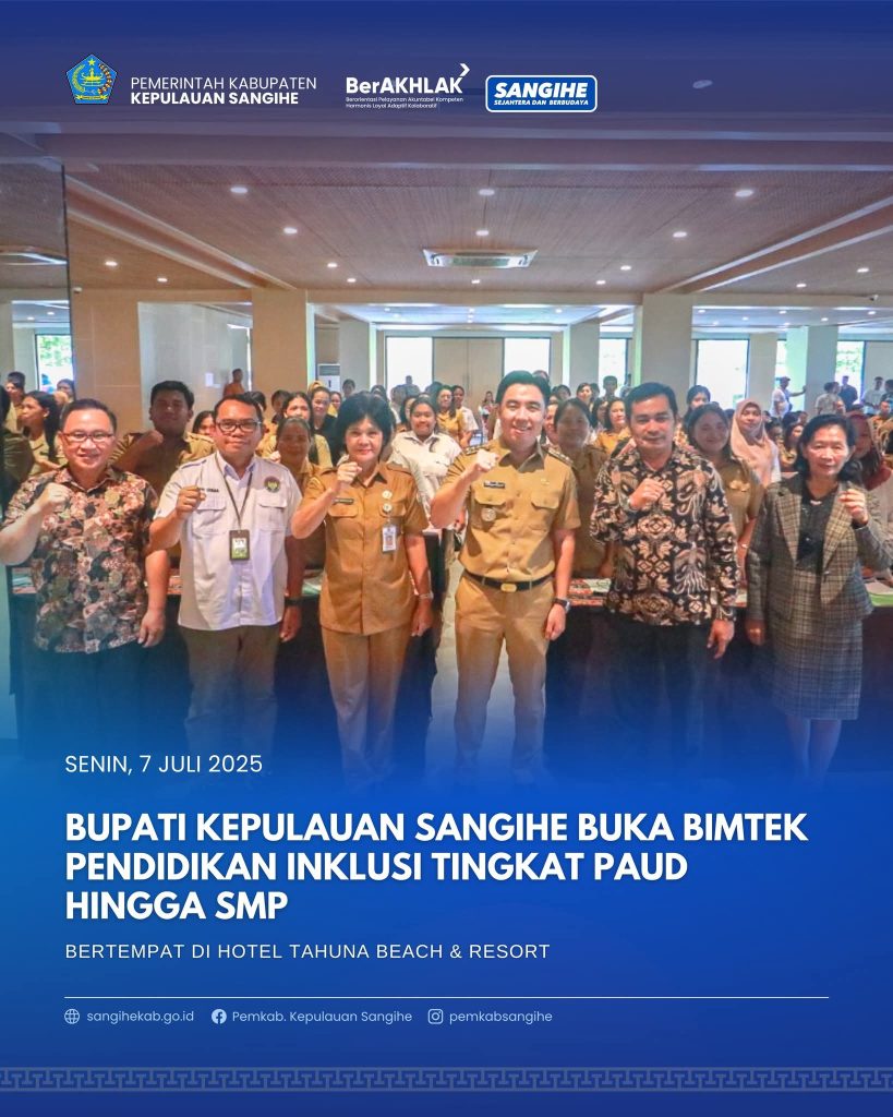 TAHUNA — Pemerintah Kabupaten Kepulauan Sangihe melalui Dinas Pendidikan dan Kebudayaan Daerah menyelenggarakan kegiatan Bimbingan Teknis (Bimtek) Pendidikan Inklusi bagi pendidik pada jenjang PAUD, SD, dan SMP. Kegiatan ini dibuka secara resmi oleh Bupati Kepulauan Sangihe, Bapak Michael Thungari, S.E., M.M., bertempat di Tahuna Beach Hotel & Resort, Senin (7/7/2025). Dalam sambutannya, Bupati Michael Thungari […]