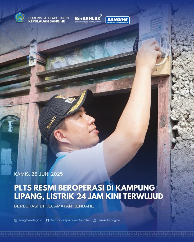 Kendahe, Kamis, 26 Juni 2025 — Pemerintah Kabupaten Kepulauan Sangihe kembali menunjukkan komitmennya dalam menghadirkan pelayanan dasar yang merata bagi seluruh masyarakat, termasuk di wilayah terluar. Hal ini ditandai dengan diresmikannya Pembangkit Listrik Tenaga Surya (PLTS) di Kampung Lipang, Kecamatan Kendahe oleh Presiden Republik Indonesia yang disaksikan Bupati Kepulauan Sangihe, Bapak Michael Thungari, S.E., M.M., […]
