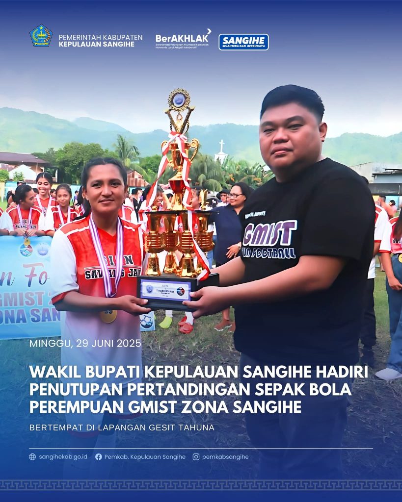 Tahuna, Minggu, 29 Juni 2025 — Wakil Bupati Kepulauan Sangihe, Bapak Tendris Bulahari, didampingi oleh Sekretaris Tim Penggerak PKK Kabupaten Kepulauan Sangihe, Ny. Agnes Bulahari Walukow, S.E., menghadiri sekaligus memberikan sambutan pada Penutupan Pertandingan Sepak Bola Perempuan GMIST Tahun 2025 Zona Sangihe, yang dilaksanakan di Lapangan Gesit Tahuna. Kegiatan pertandingan ini merupakan bagian dari program […]