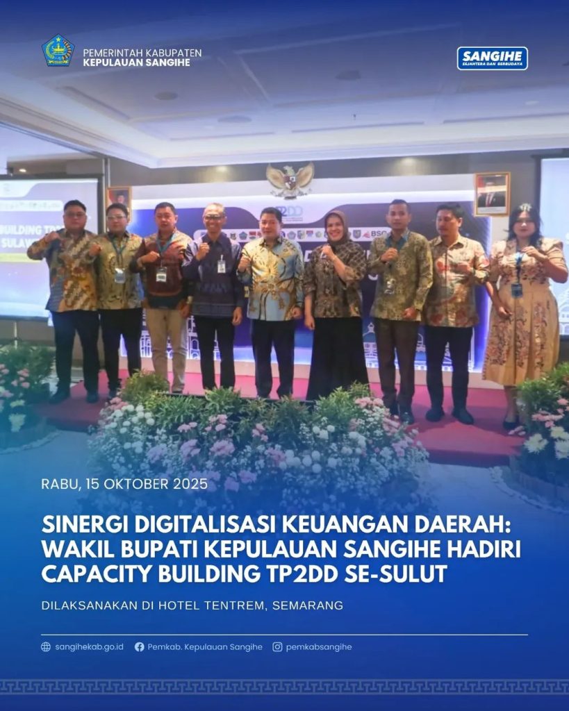 Semarang, 15 Oktober 2025 — Wakil Bupati Kepulauan Sangihe, Bapak Tendris Bulahari, menghadiri kegiatan Capacity Building Tim Percepatan dan Perluasan Digitalisasi Daerah (TP2DD) se-Provinsi Sulawesi Utara yang diselenggarakan di Hotel Tentrem, Semarang. Kegiatan ini digelar sebagai langkah strategis untuk mempercepat serta memperluas implementasi digitalisasi sistem keuangan daerah di seluruh wilayah Provinsi Sulawesi Utara. Turut hadir […]