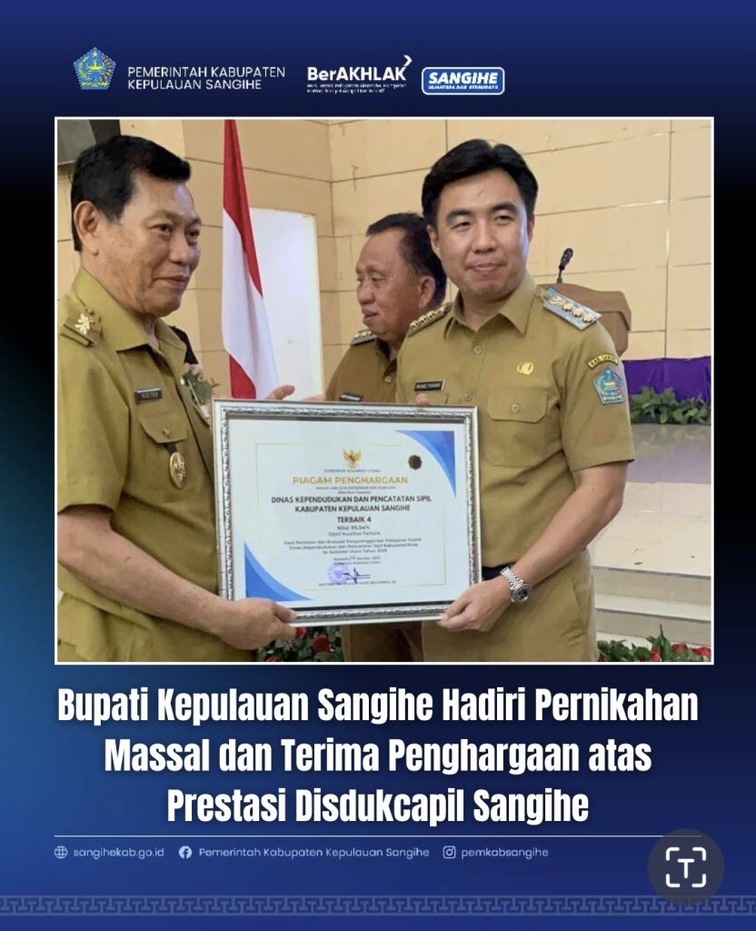 Bupati Kepulauan Sangihe Hadiri Pernikahan Massal dan Terima Penghargaan atas Prestasi Disdukcapil Sangihe