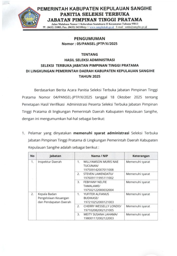 Pengumuman Hasil Seleksi Administrasi Seleksi Terbuka Jabatan Pimpinan Tinggi Pratama di Lingkungan Pemerintah Daerah Kabupaten Kepulauan Sangihe Tahun 2025.
